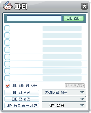 - 파티장의 경우 아이템 획득 / 파티장 변경 / 애완동물 습득 제한 권한을 가짐
