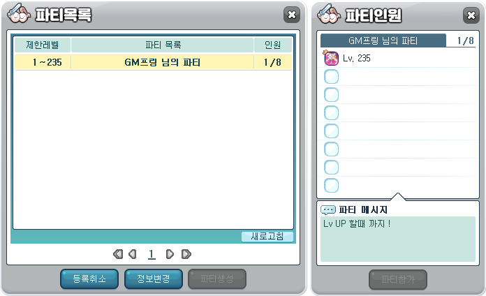 - 파티찾기 창에서 “정보변경”을 선택하면 파티생성 시의 설정과 같은 창이 출력되며,