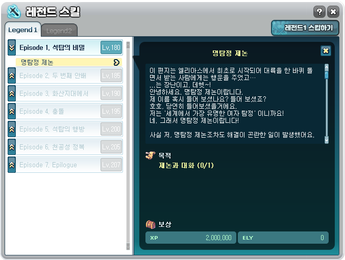 - Lv.180 달성 시 레전드 퀘스트가 시작되며, 에피소드별 퀘스트 시작 레벨이 다릅니다.