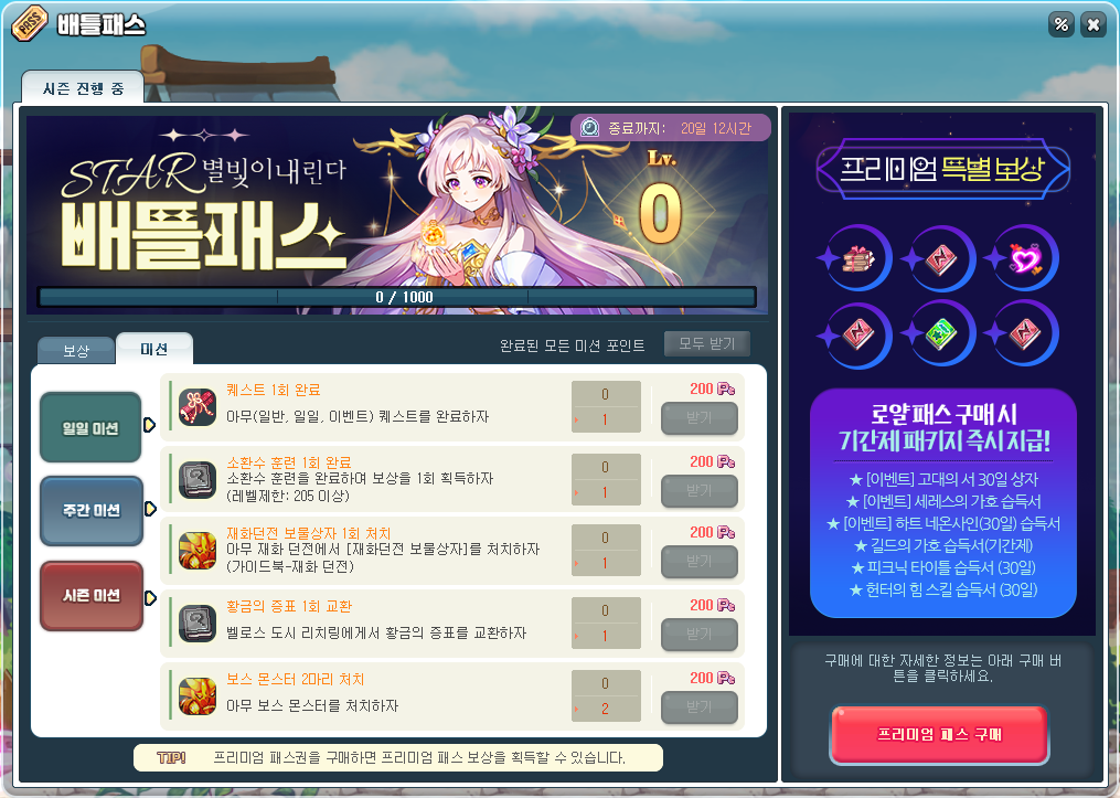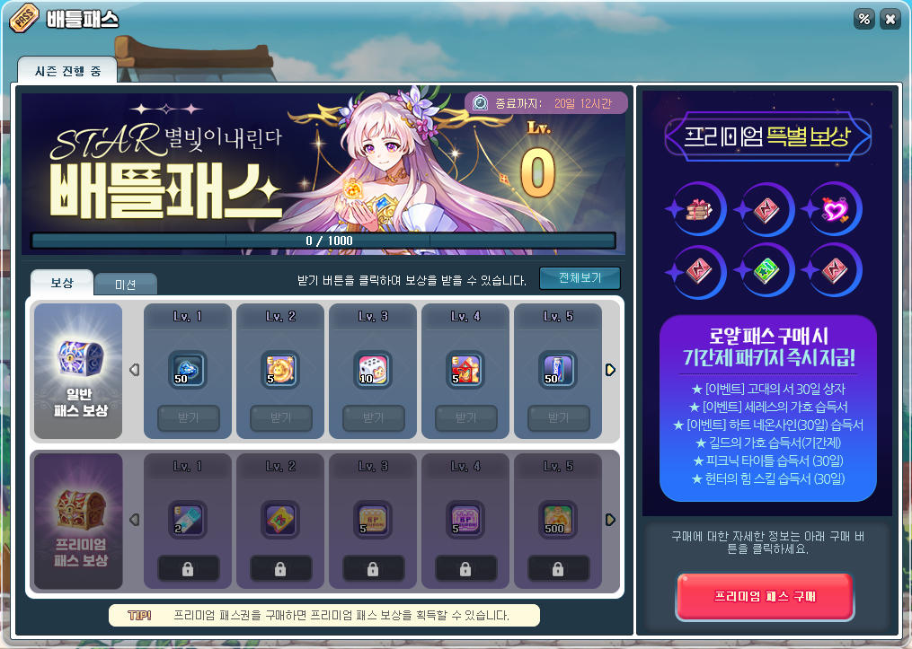 1) 프리미엄 패스: 구매 즉시 프리미엄 보상 활성화
