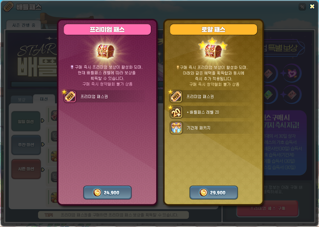- 일반 배틀패스와 프리미엄 배틀패스로 구분되어 있으며,