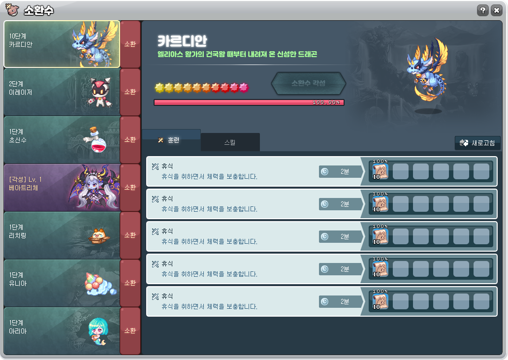 - 휴식중인 소환수를 소환하기 위해서는 40장의 소환 주문서 필요 (리치링, 아리아 제외)