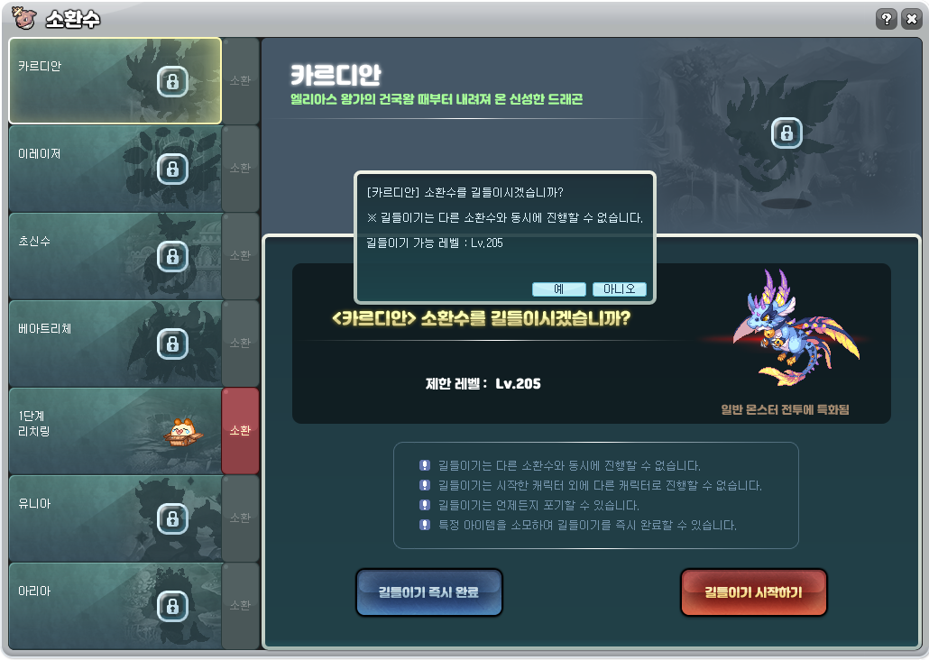 - 소환수 이미지를 클릭하여 '길들이기 시작하기'를 진행합니다.