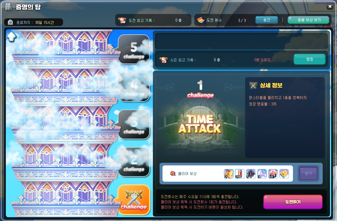 - 매주 수요일 오전 11시경 증명의 탑 도전 횟수(3회) 무료 충전