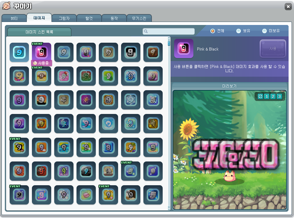 - 특정 대미지 스킨의 경우 각 대미지 스킨에 해당하는 아이템을 소지해야 구입 및 사용이 가능합니다.