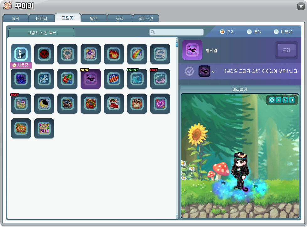 - 각 그림자 스킨에 해당하는 아이템을 소지한 경우 구입 및 사용이 가능합니다.