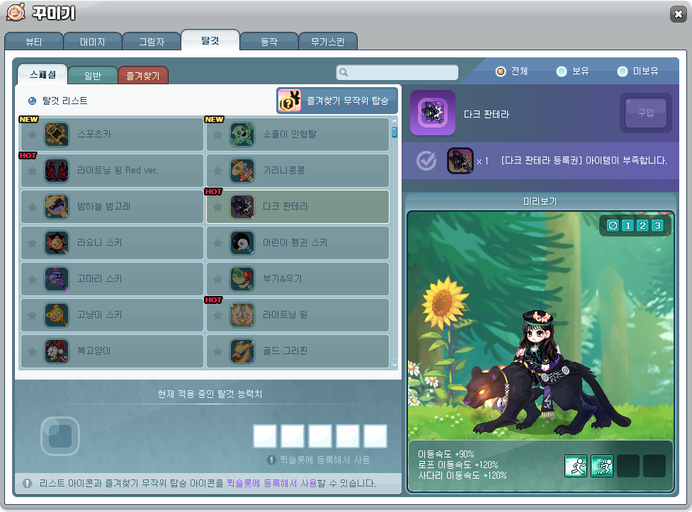 - 탈것의 스킬은 퀵슬롯에 등록하여 사용이 가능합니다.