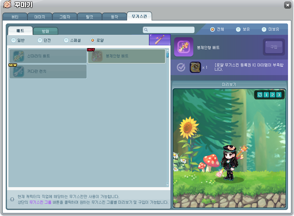 - 현재 캐릭터의 직업에 해당하는 무기스킨만 사용이 가능합니다.