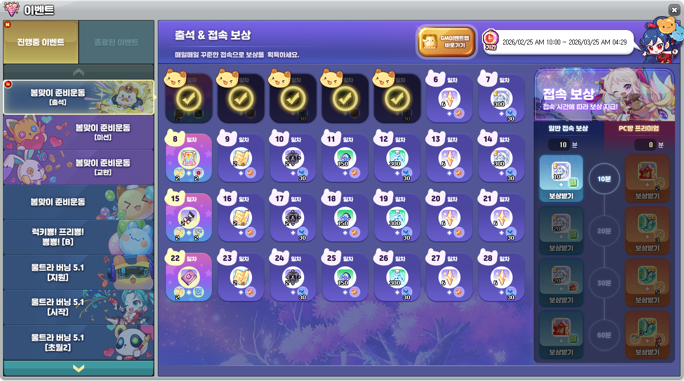- 접속 보상: 일정 시간 이상 접속 시 획득 가능한 보상 (보상 활성화 시 수령 가능)