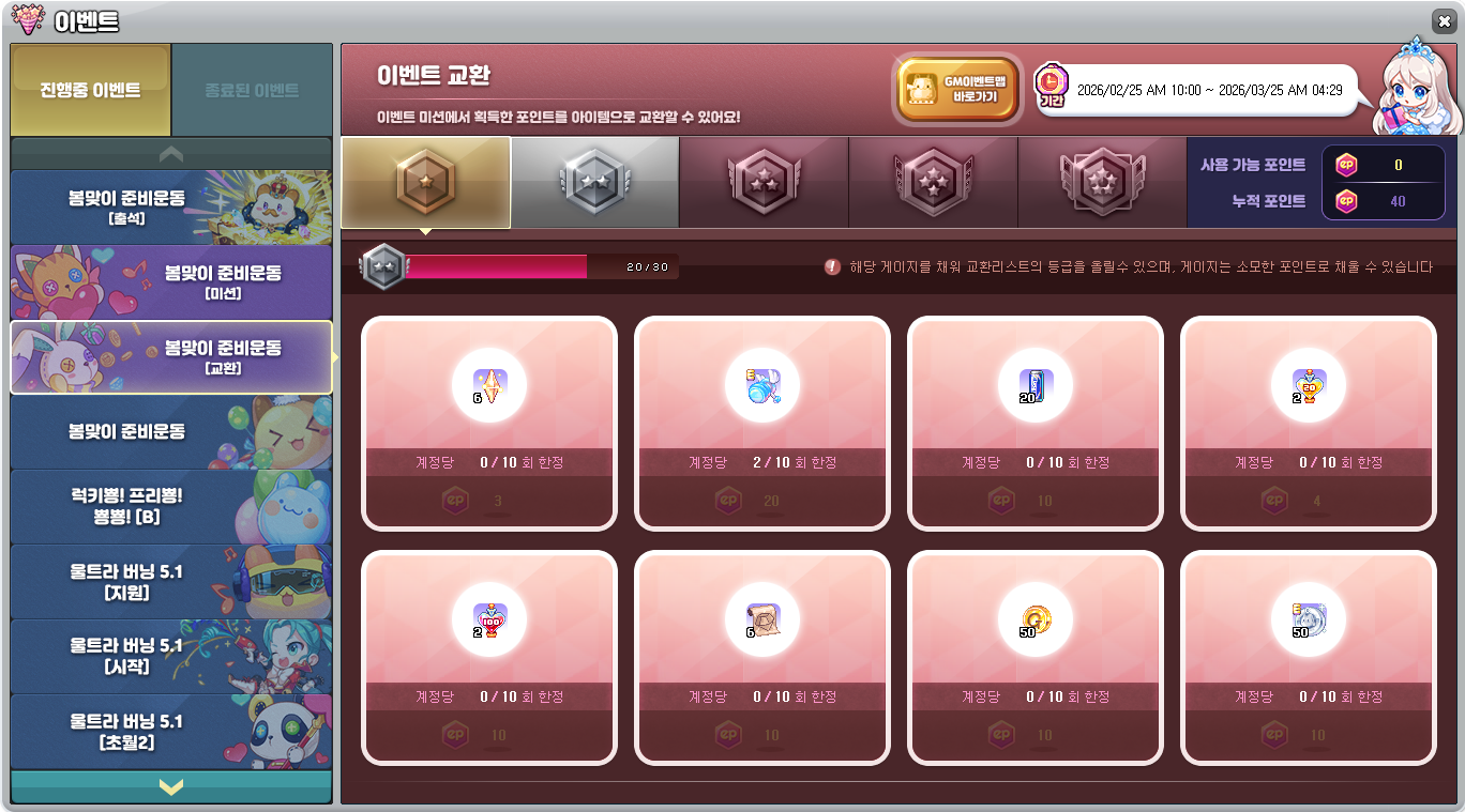 - 획득한 포인트는 [교환] 탭에서 원하는 한정 아이템으로 교환 가능