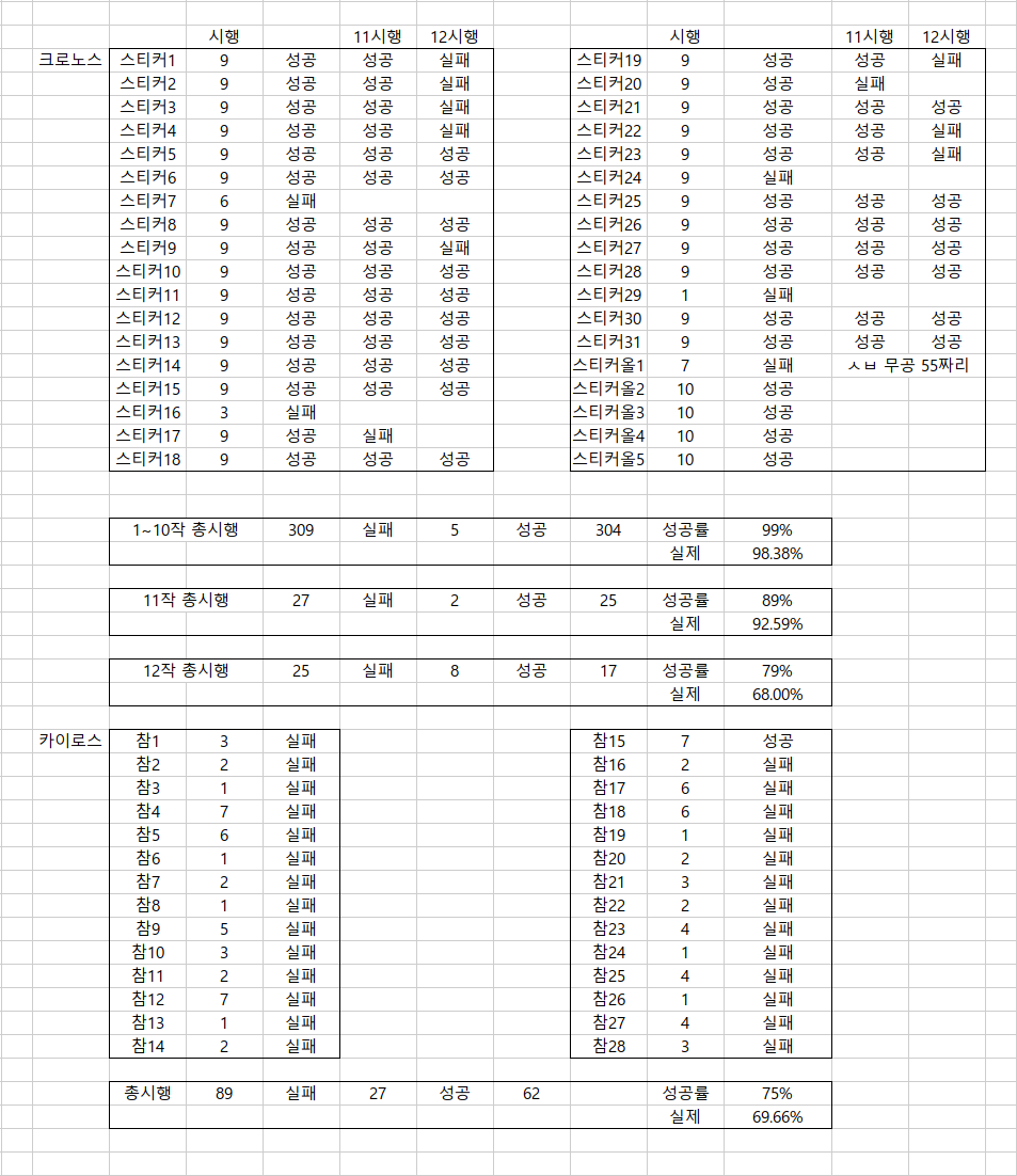 * 스티커에 올* 붙은것은 올스텟 인챈트 한 것. 옵재로 올스텟까지 챙기진 않기 때문에 대부분 10회