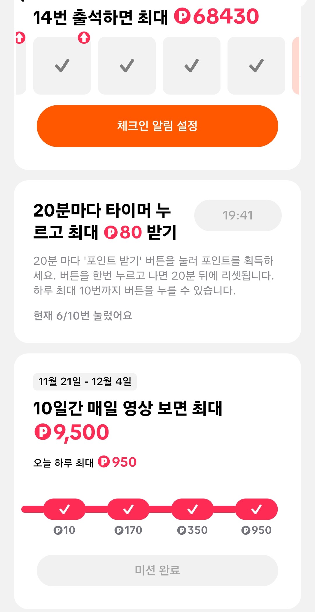 3. 시청하기 너무 긴건 효율 떨어지니 15분 시청 미션이랑 출석체크 하면 총 4만 포인트 이상(하루 기본 소요시간 15분)