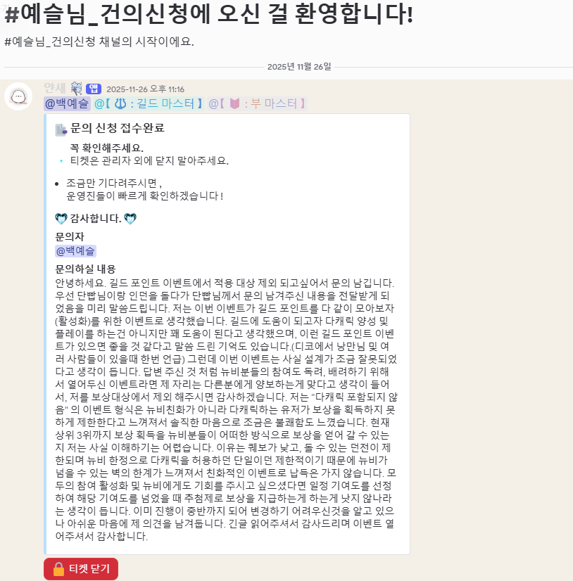 5. 25년 11월 26일 길드 포인트 이벤트 진행에 대한 취지가 앞뒤가 맞지않다고 판단되어 불쾌함 표시 및 건의
