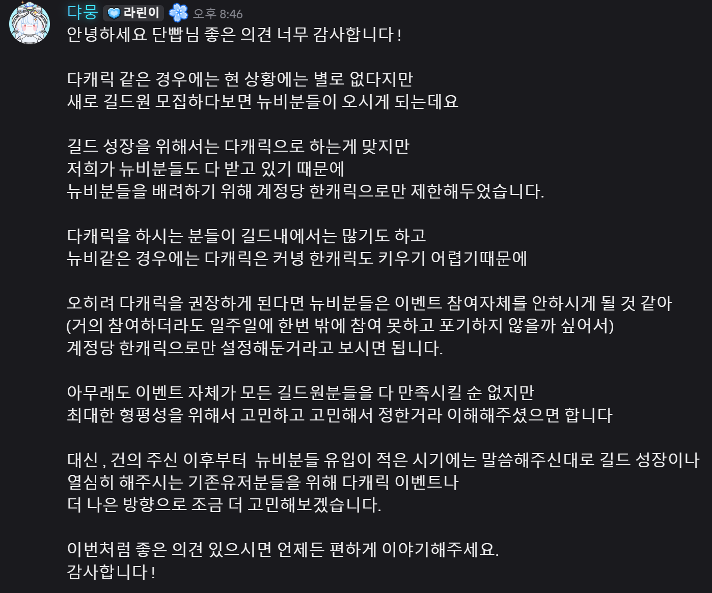 또, 다른 길드원들과 불편함도 없었으며 분란도 없었고요.