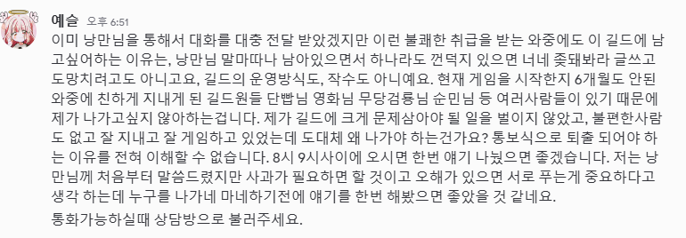 3. 25년 11월 17일 위 일로 부길드마스터 낭만 과 1:1 통화진행, 불만표시 및 건의사항 전달 (이후 낭만 측에서 잘부탁드린다고 하길래 해당건 종료로 알고있었음.)
