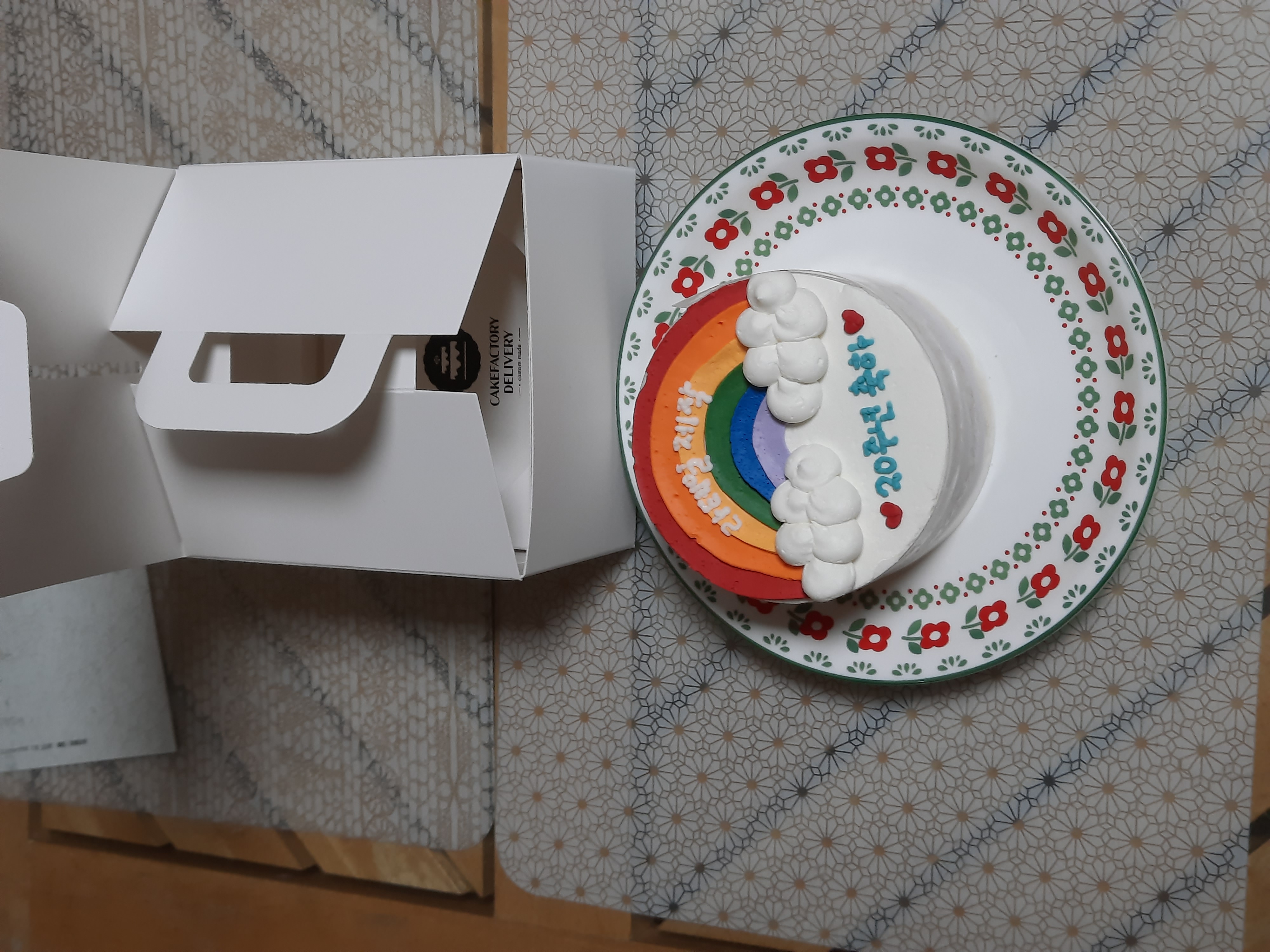 레터링 문구는 각각 6글자 이내여서 라테일 제작 축하를 담았고 케이크 외형 디자인은 이리스의 유래인 무지개의 여신이 떠올라서 무지개를 선택했습니다.