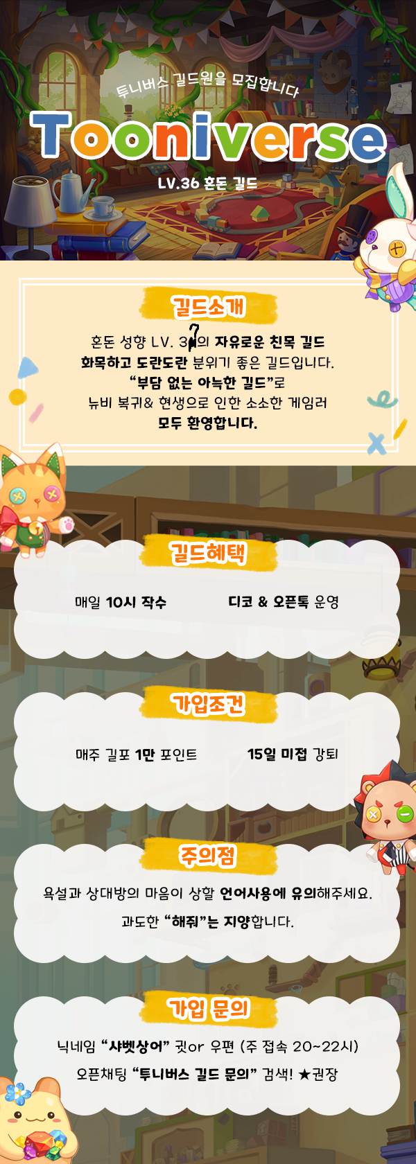 Tooniverse길드에 온걸 환영한다. 우리는 유쾌, 상쾌, 통쾌