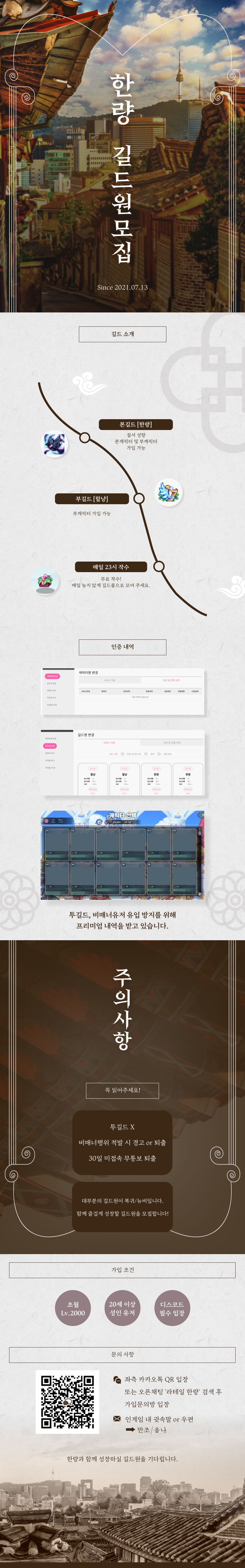 길드 분위기, 평균 접속률, 성향 등 궁금한 점이 있다면 오픈채팅방에서 편하게 문의 부탁드립니다.