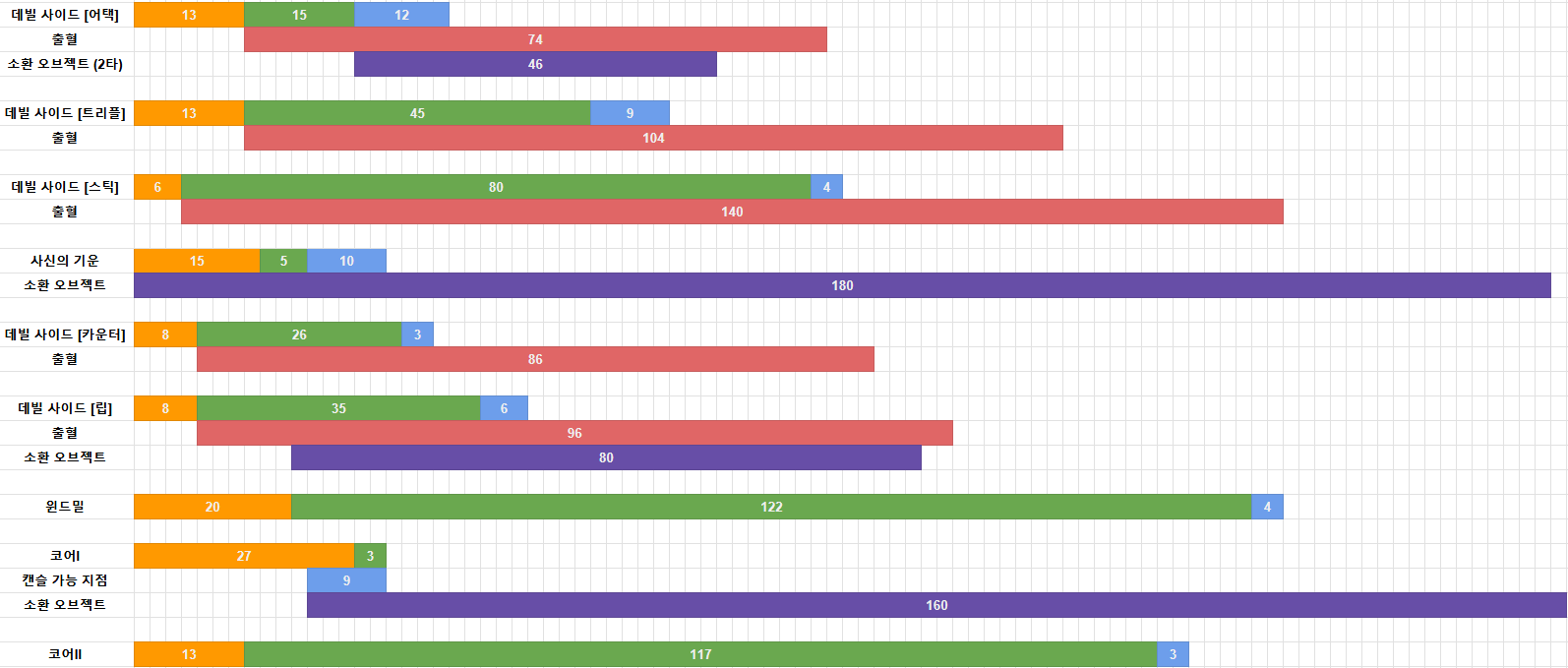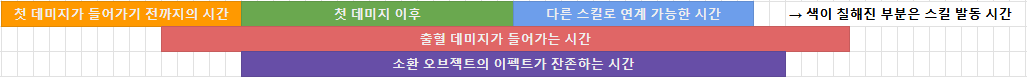 (주황색 - 선딜, 초록색 - 선후딜 제외한 시간, 파란색 - 캔슬 가능 지점, 빨간색 - 출혈, 보라색 - 소환 오브젝트)