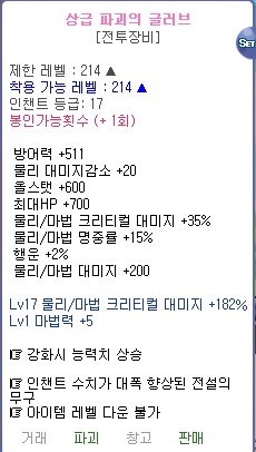 [팝니다] 상급 파괴 장갑 17작 182퍼 팜