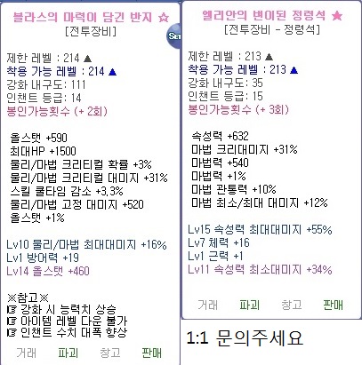 [팝니다] 블라스반지1강/엘리안 정령석2강/흑랑옥 고수치