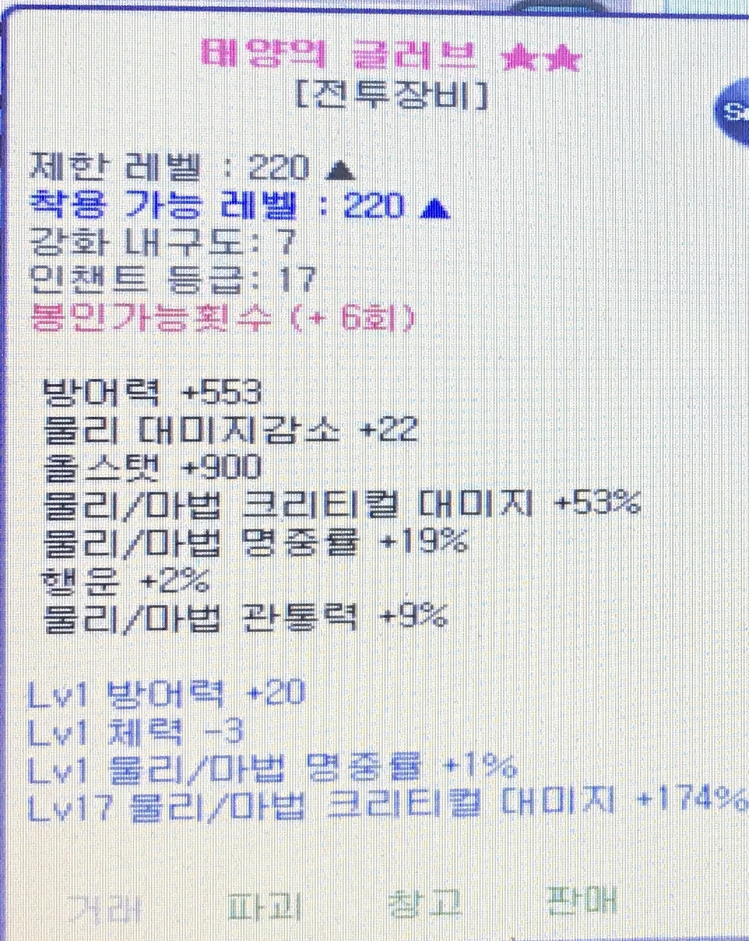 [팝니다] 태양장갑 4강 174퍼 팝니다